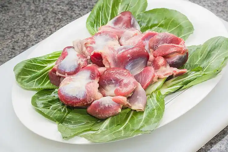 新鲜生的鸡胗盛放在白色瓷碟子里