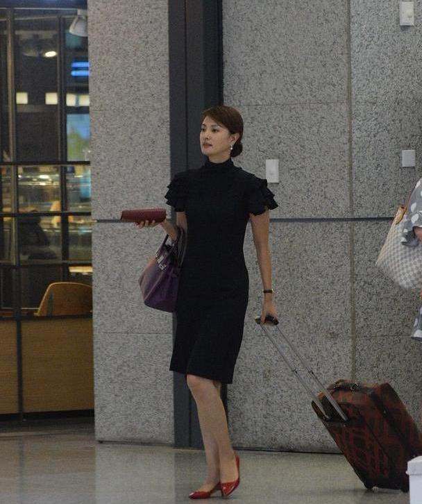 43岁的刘芳菲走机场搭配黑色连衣裙气质优雅好身材是关键