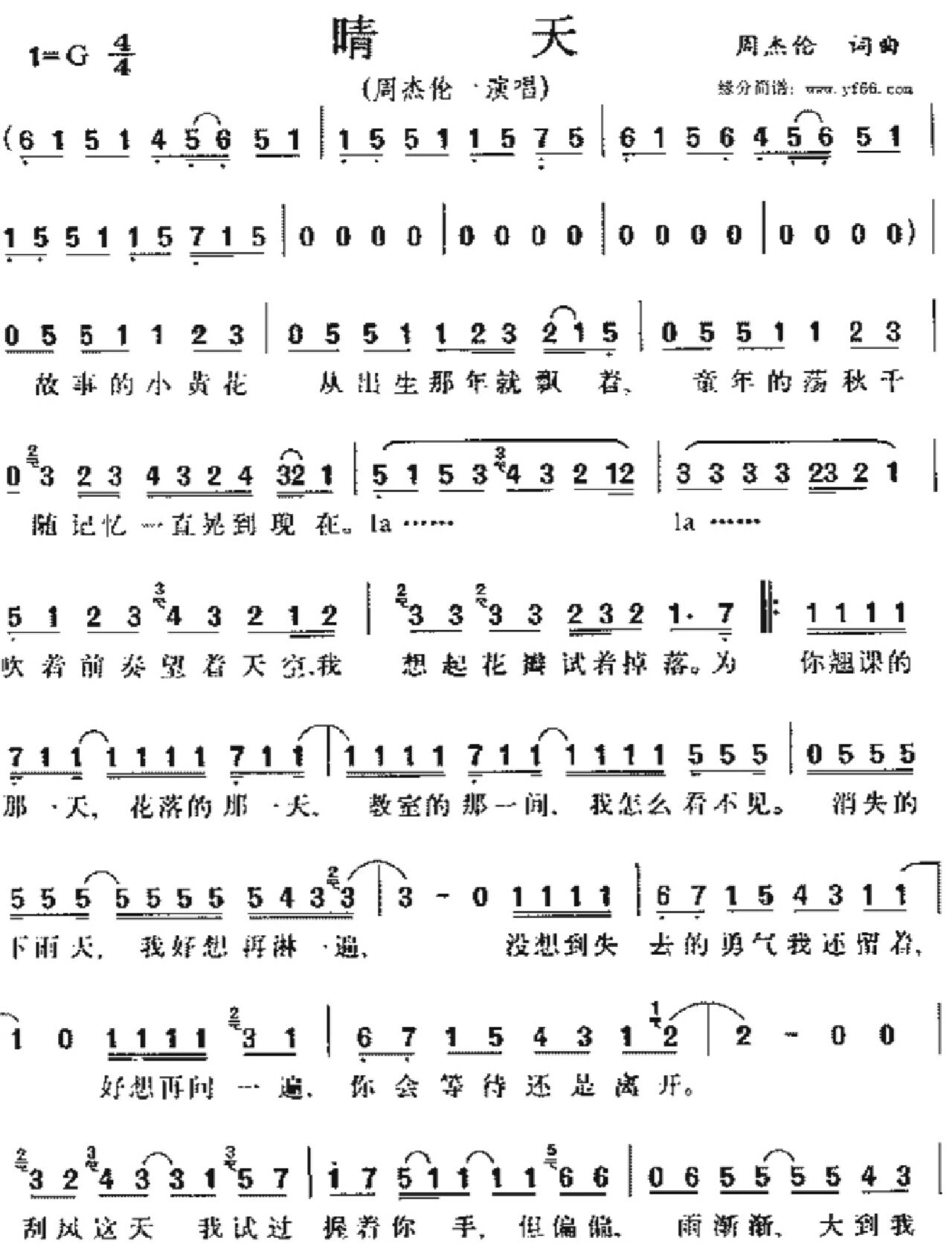 晴天简谱-周杰伦-送给少年时代的我们1