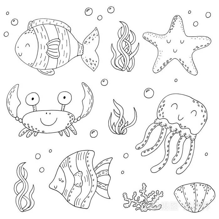 插画 例证矢量涂鸦集海洋生物的元素.水下世界收藏.