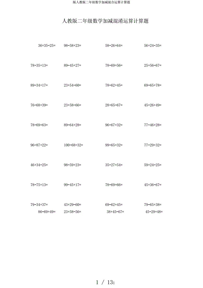 版人教版二年级数学加减混合运算计算题.docx 13页
