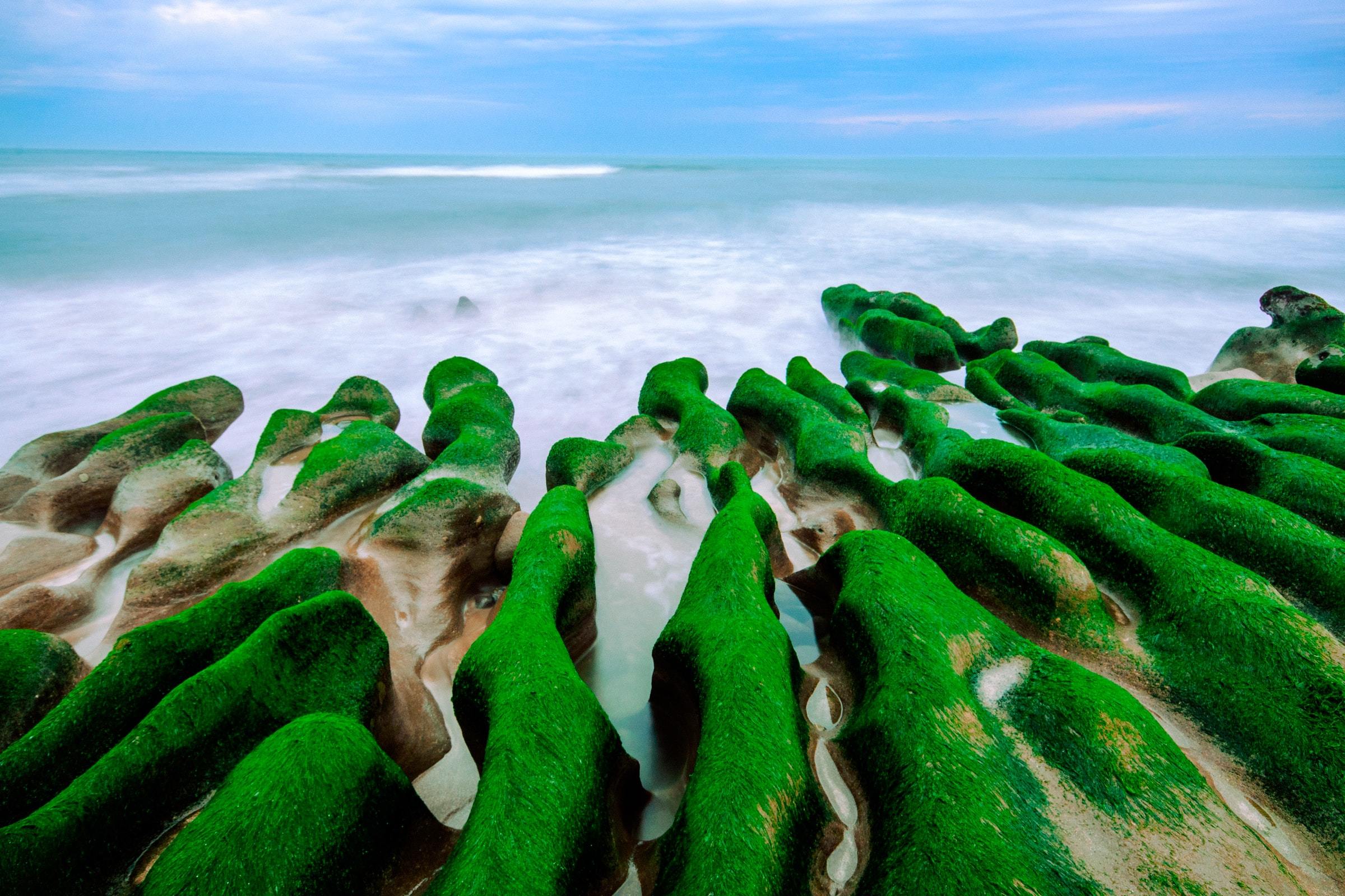 长满青苔的海边礁石,如纹理般被海浪的礁石唯美壁纸图片