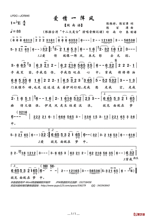 爱情一阵风简谱(歌词)-台湾"十二大美女"演唱-岭南印象曲谱1