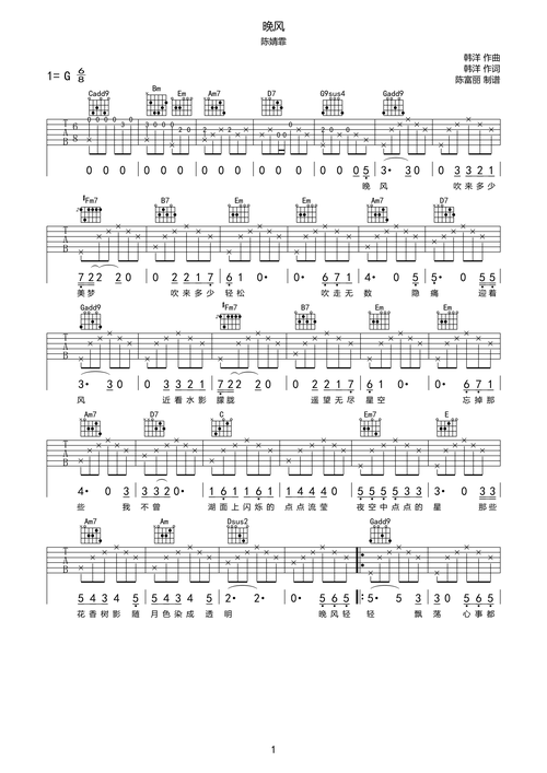 晚风吉他谱_g调_陈婧霏《晚风》弹唱六线谱|酷玩吉他|扒谱制谱,高品质
