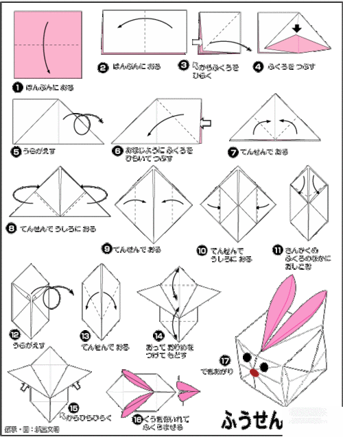 03 折纸气球兔子 主要材料:各色彩纸 制作步骤:*注意:折痕是关键 04
