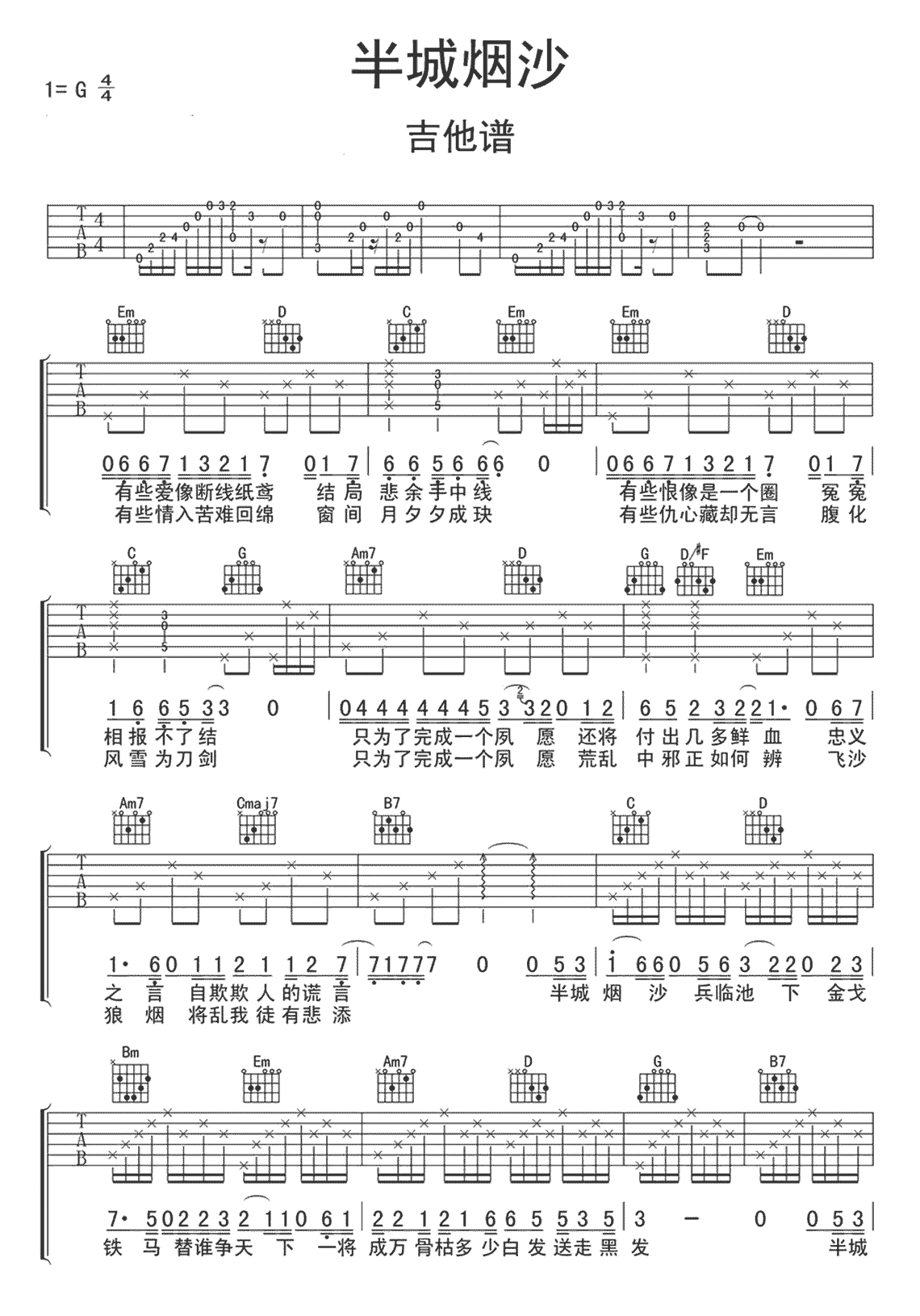 半城烟沙吉他谱·许嵩《半城烟沙》吉他谱g调 - g调吉他谱大全 - 吉他