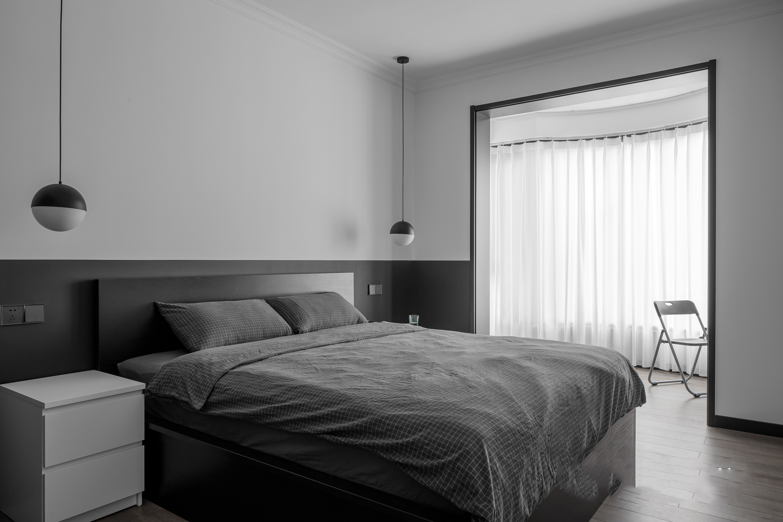 卧室也是以暗灰色的氛围,床头挂一幅横幅黑白画,结合轻盈的窗帘,简洁