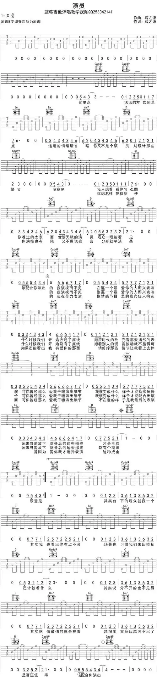 薛之谦《演员》吉他谱_g调简单和弦编排_男生降全音调弦_女生夹4品_胡