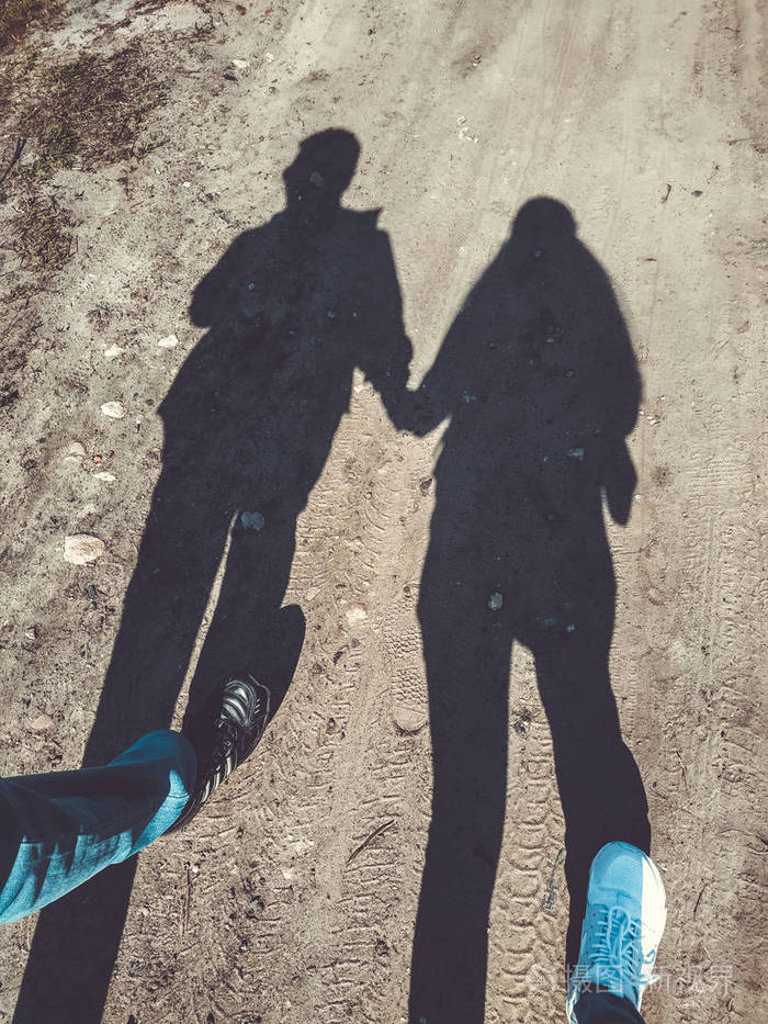 一对恋人的剪影在手牵手的爱情上投下了长长的影子街道阴影步行的行人