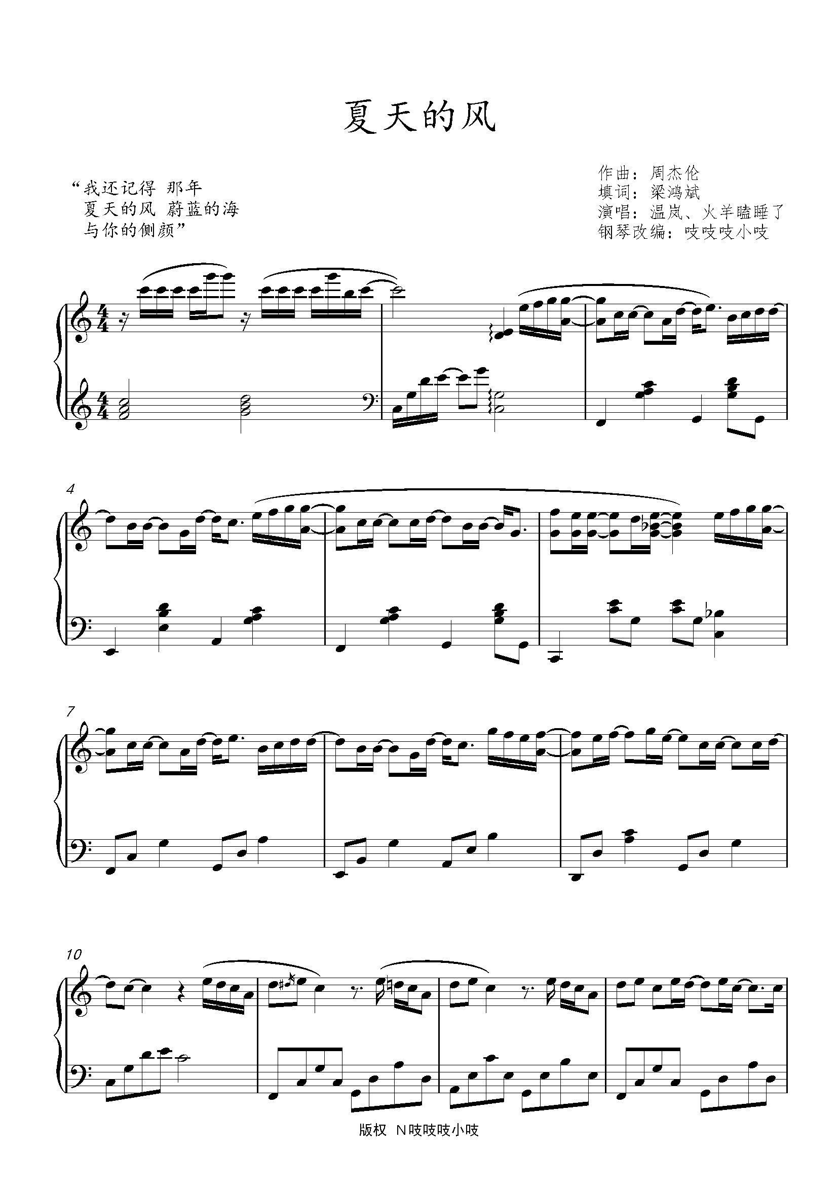 【钢琴谱】夏天的风 周杰伦作曲 #大象腿钢琴谱 - 抖音