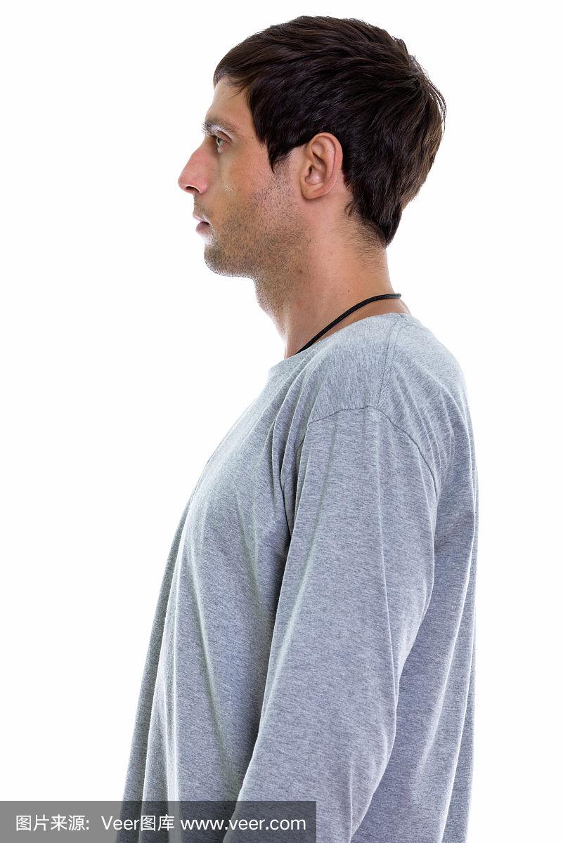 年轻英俊的男人在孤立的背景下,看着侧面放松的轮廓姿势,自然的脸