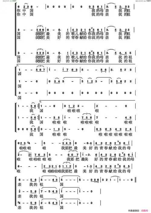 我爱你中国男女三声部合唱简谱-曲谱网