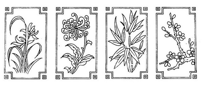 j002梅兰竹菊白描线稿雕刻素材梅花荷花竹子菊花鸟线描线雕图案