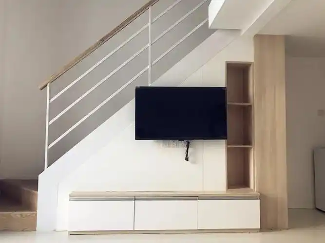 小编只给一招,就是楼梯下的空间直接装电视柜,旁边有多余的空间还能装