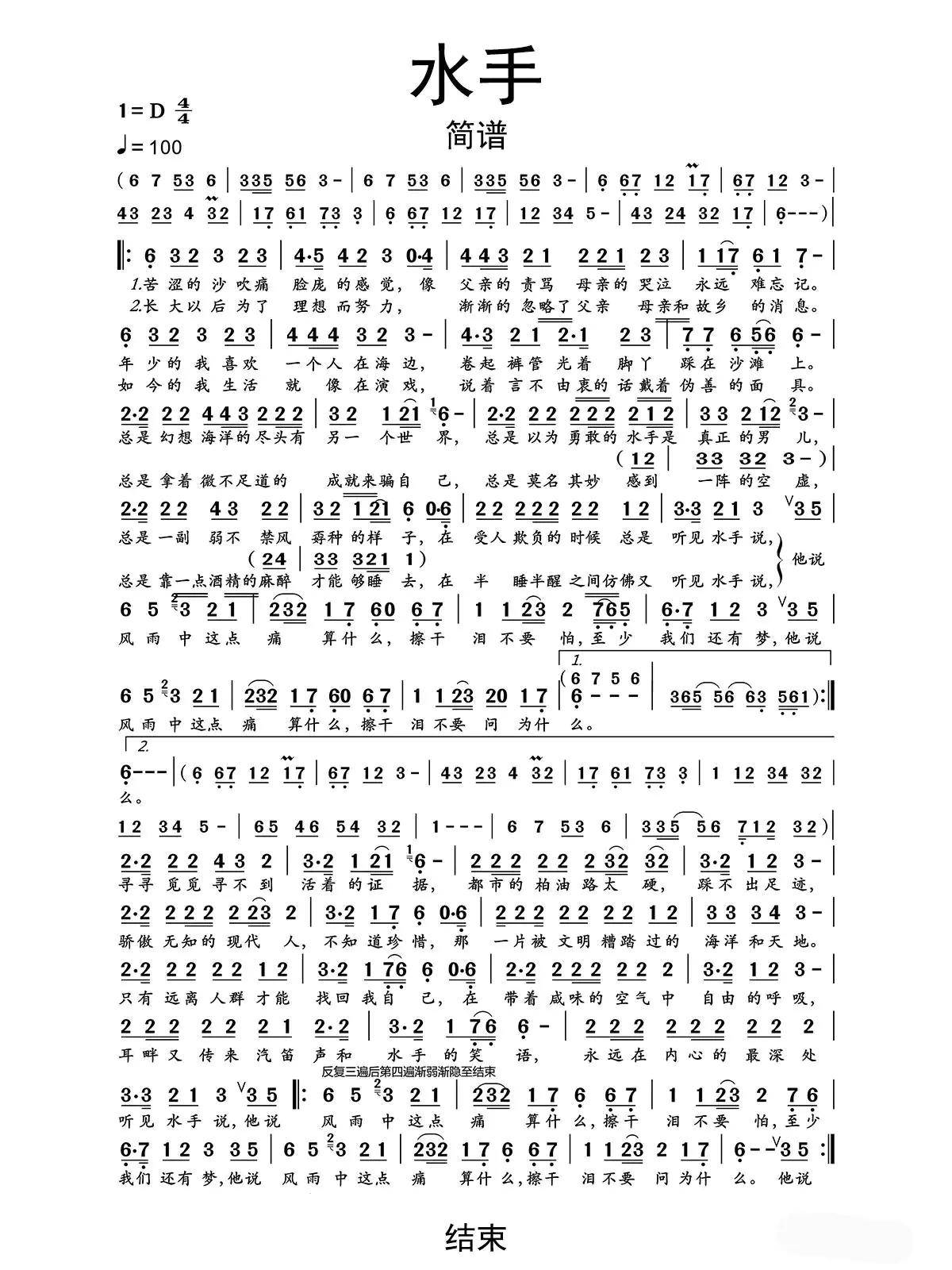 水手简谱 歌谱-苍强曲谱