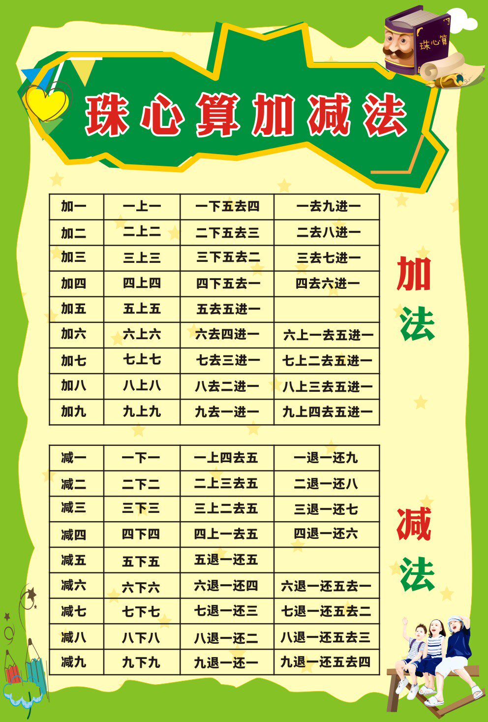 小学生九行九行珠心算口诀表海报数学宝宝学珠算加法口诀表挂图