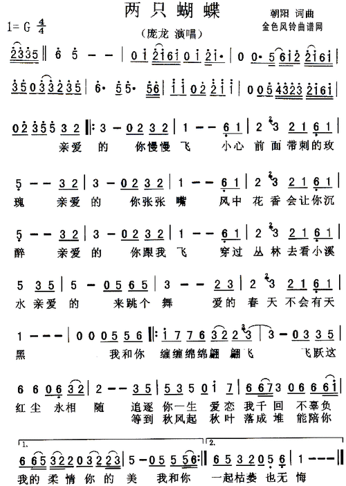 两只蝴蝶简谱(歌词)_庞龙演唱_君羊制谱