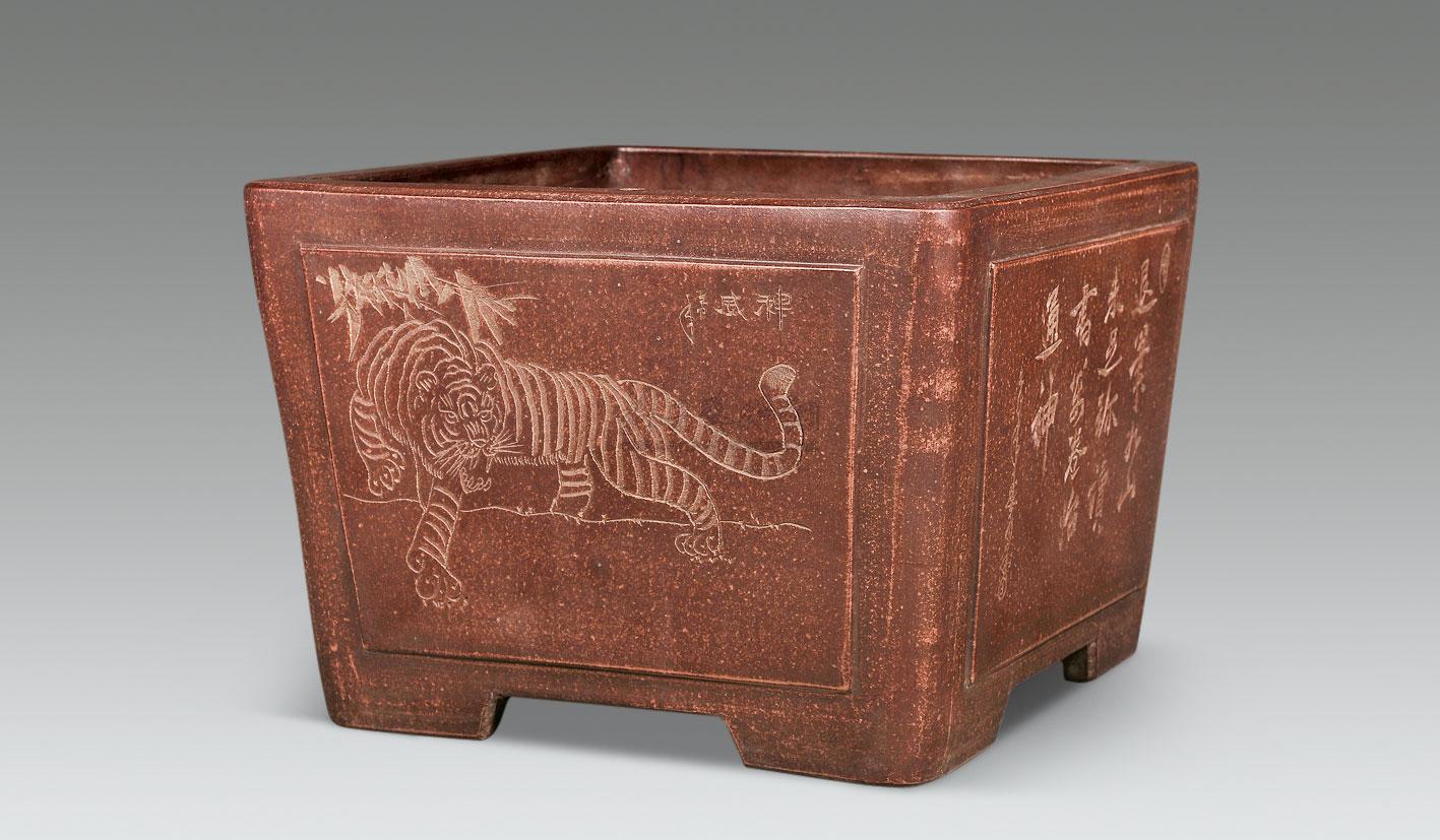 文革时期煅泥加彩刻花鸟纹四方紫砂花盆