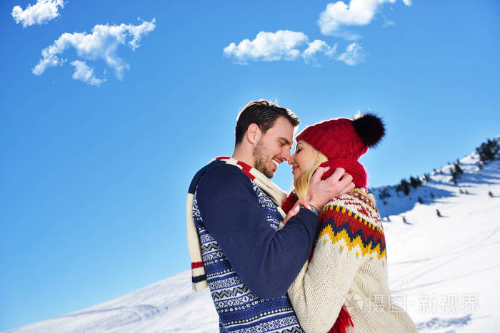 一对相爱的夫妇坐在山上的草地上拥抱着