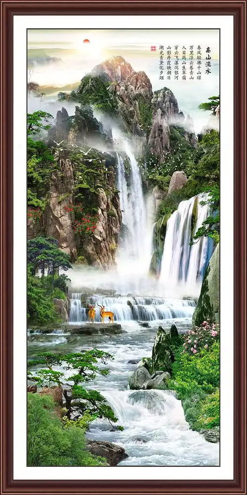 xt90426中式玄关山水瀑布高山流水梅花鹿太阳寓意黄绿色