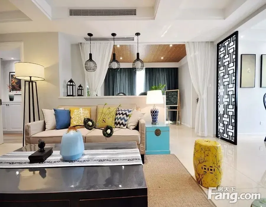 客厅和别的区域在沙发后面用隔断这样空间显得大气沙发后面又有背景墙
