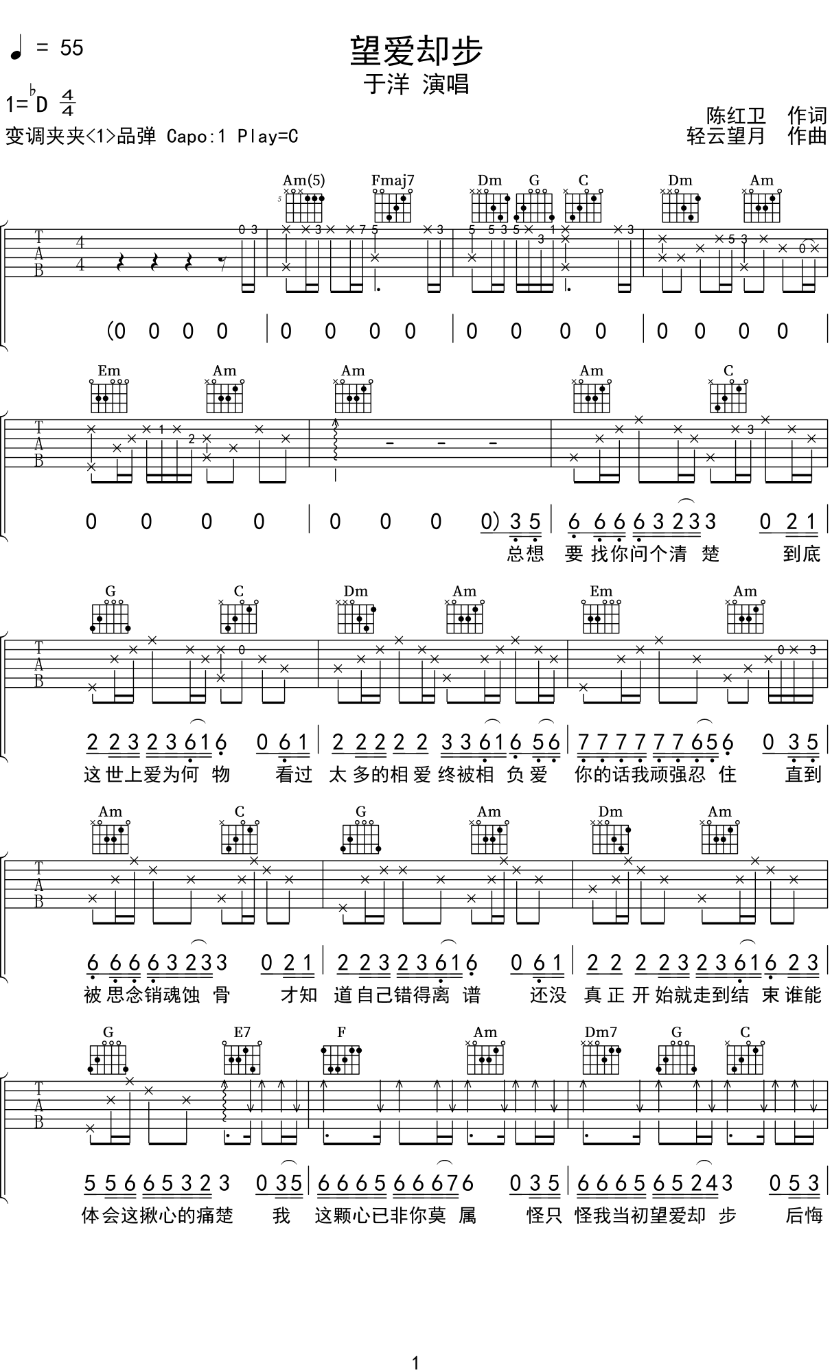 望爱却步吉他谱于洋-c调弹唱谱六线谱