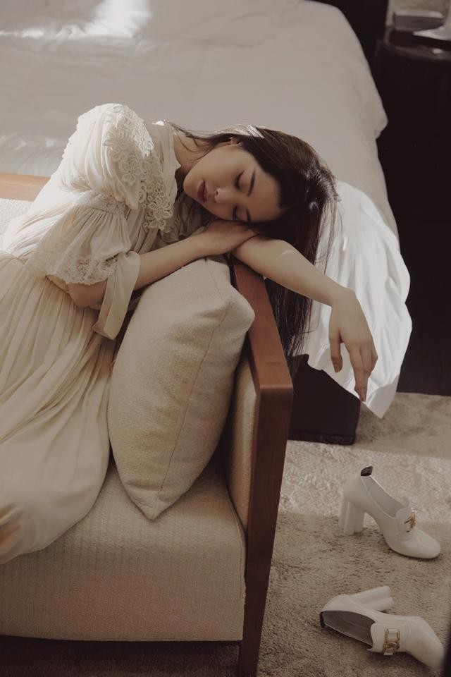 欧阳娜娜穿仙女裙,躺在沙发上凹造型,当她睡着那一刻画面太唯美