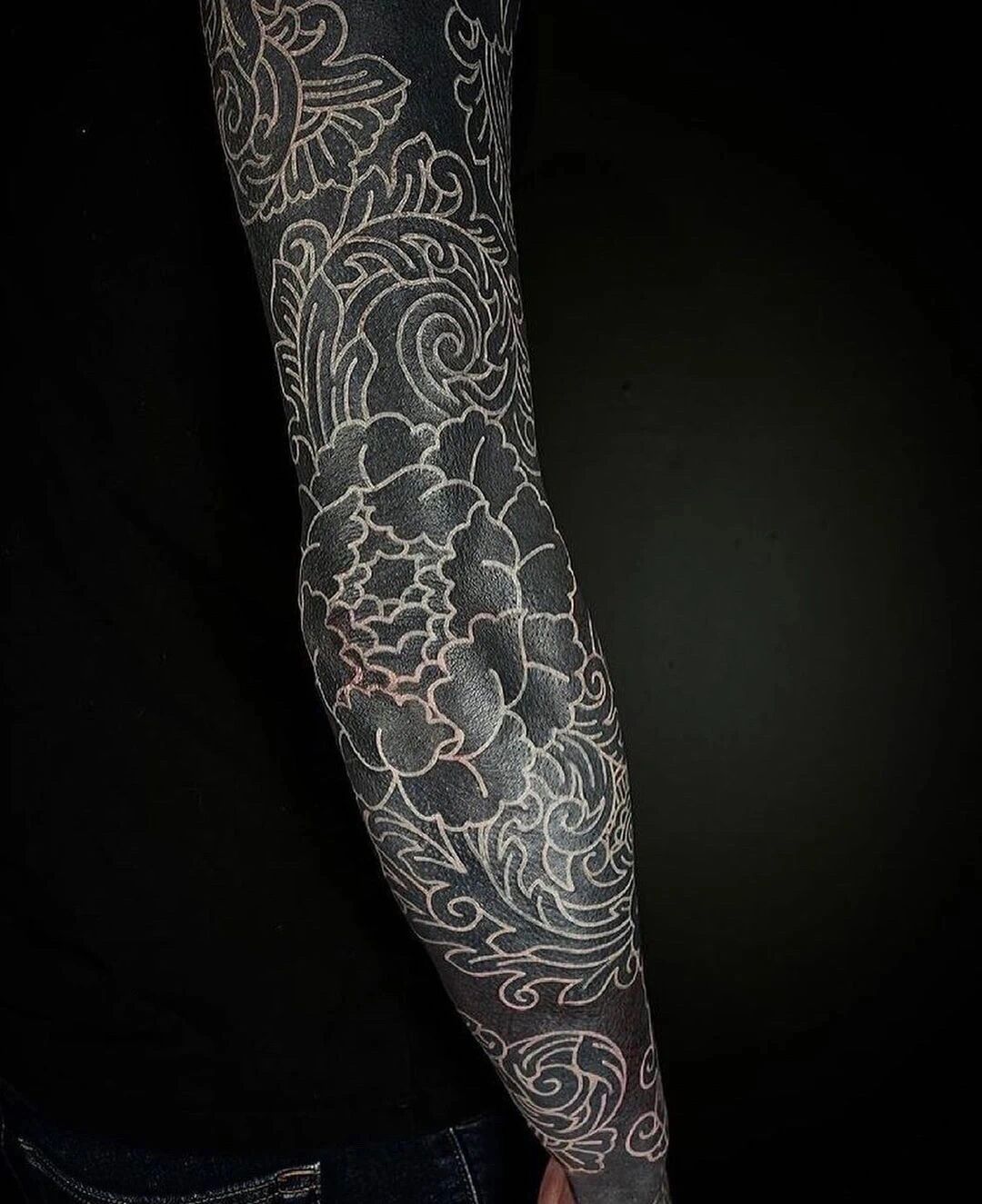 黑花臂纹身图片_手臂欧美写实黑臂花臂纹身图案