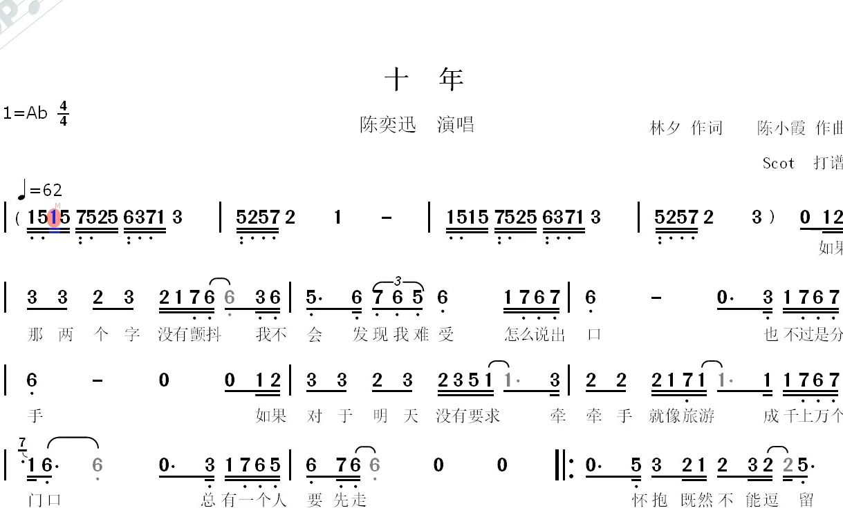 十年简谱-陈奕迅演唱-林夕/陈小霞词曲1