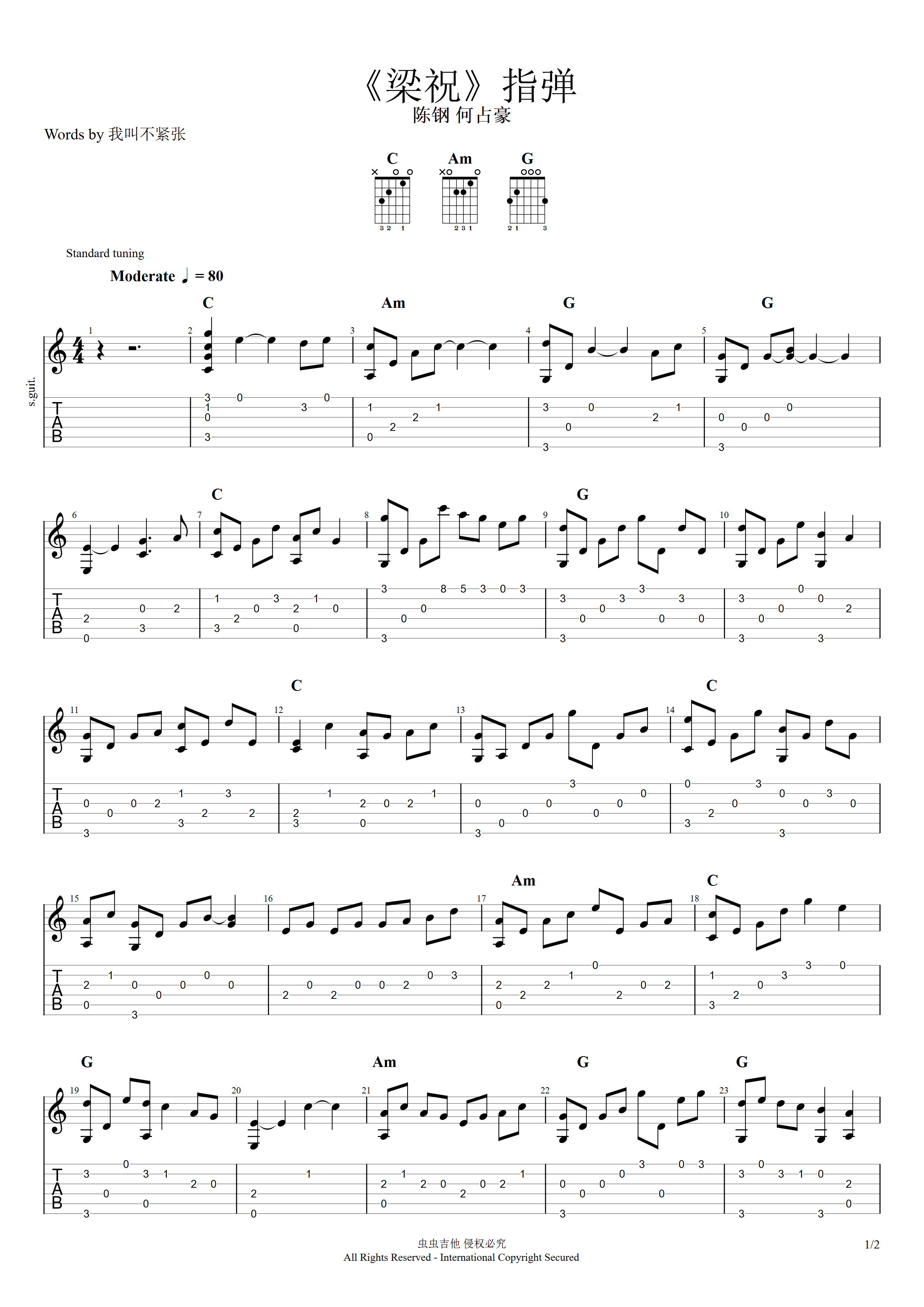 梁祝吉他谱-指弹谱-c调-虫虫吉他