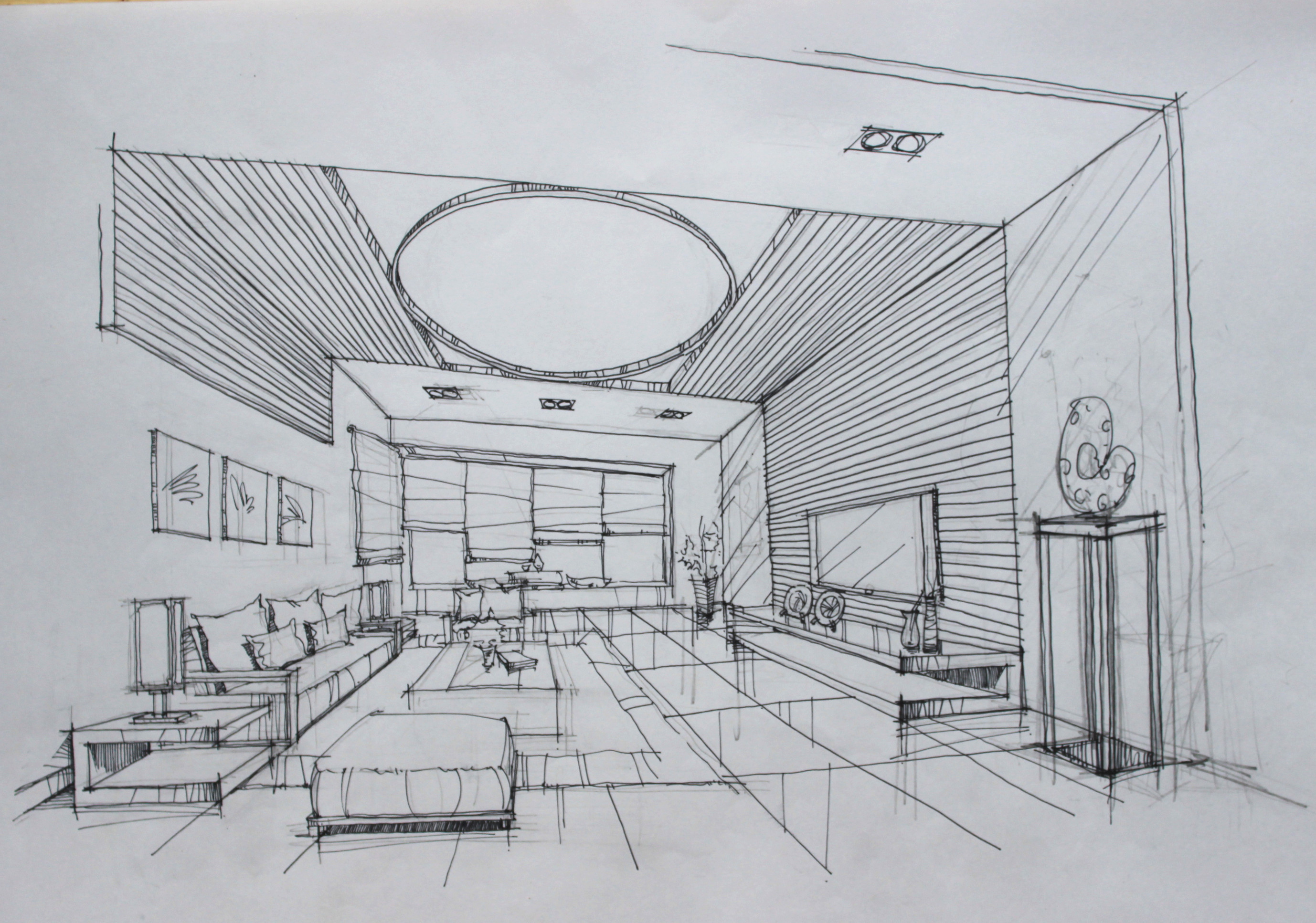 客厅空间一点透视黑白效果绘制步骤图._一叶手绘-站酷zcool