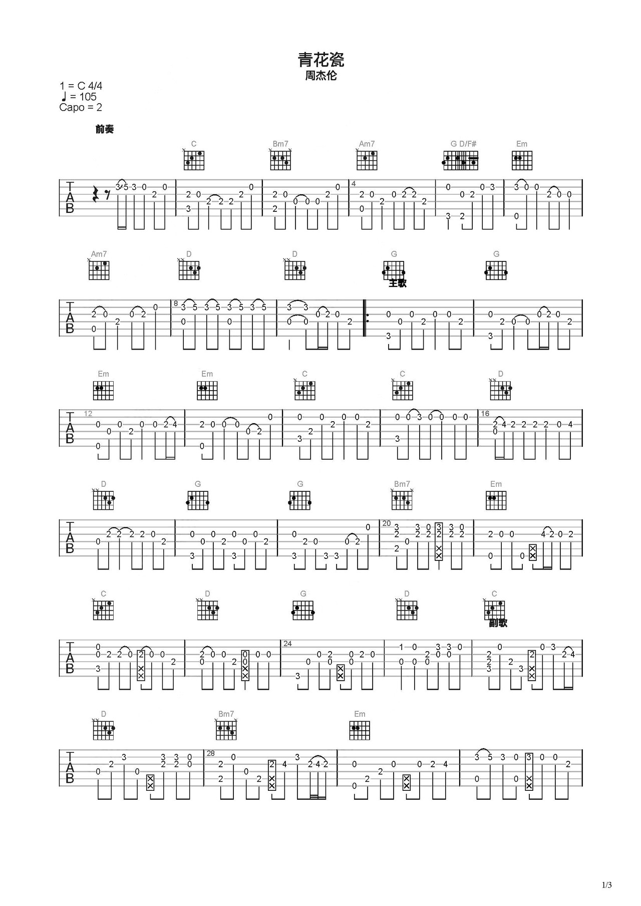 周杰伦青花瓷吉他谱c调吉他指弹独奏谱