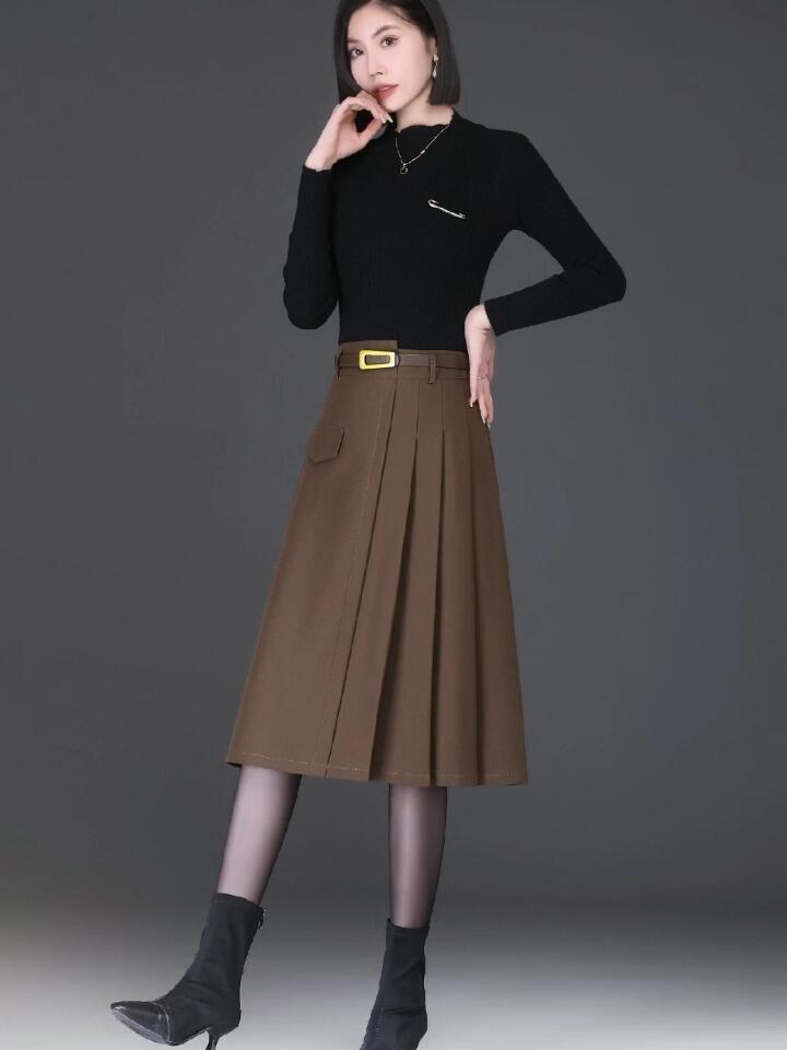 2021咖啡色毛呢半身裙女秋冬过膝中长款气质高腰显瘦a字大摆裙