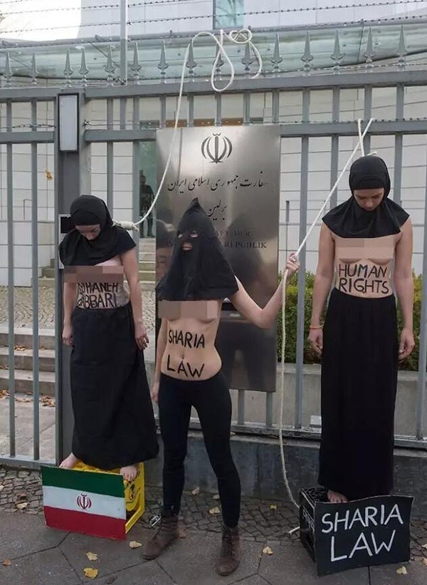 使馆前半裸示威,抗议伊朗女子贾巴里因反抗性侵自卫杀人而被处以绞刑