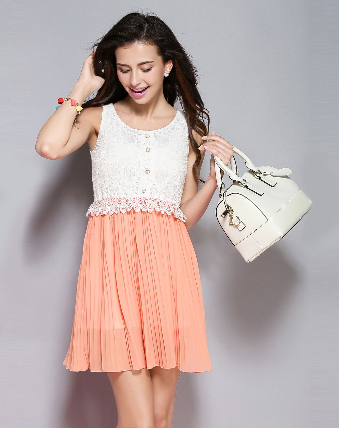 虾粉色圆领蕾丝雪纺无袖连衣裙