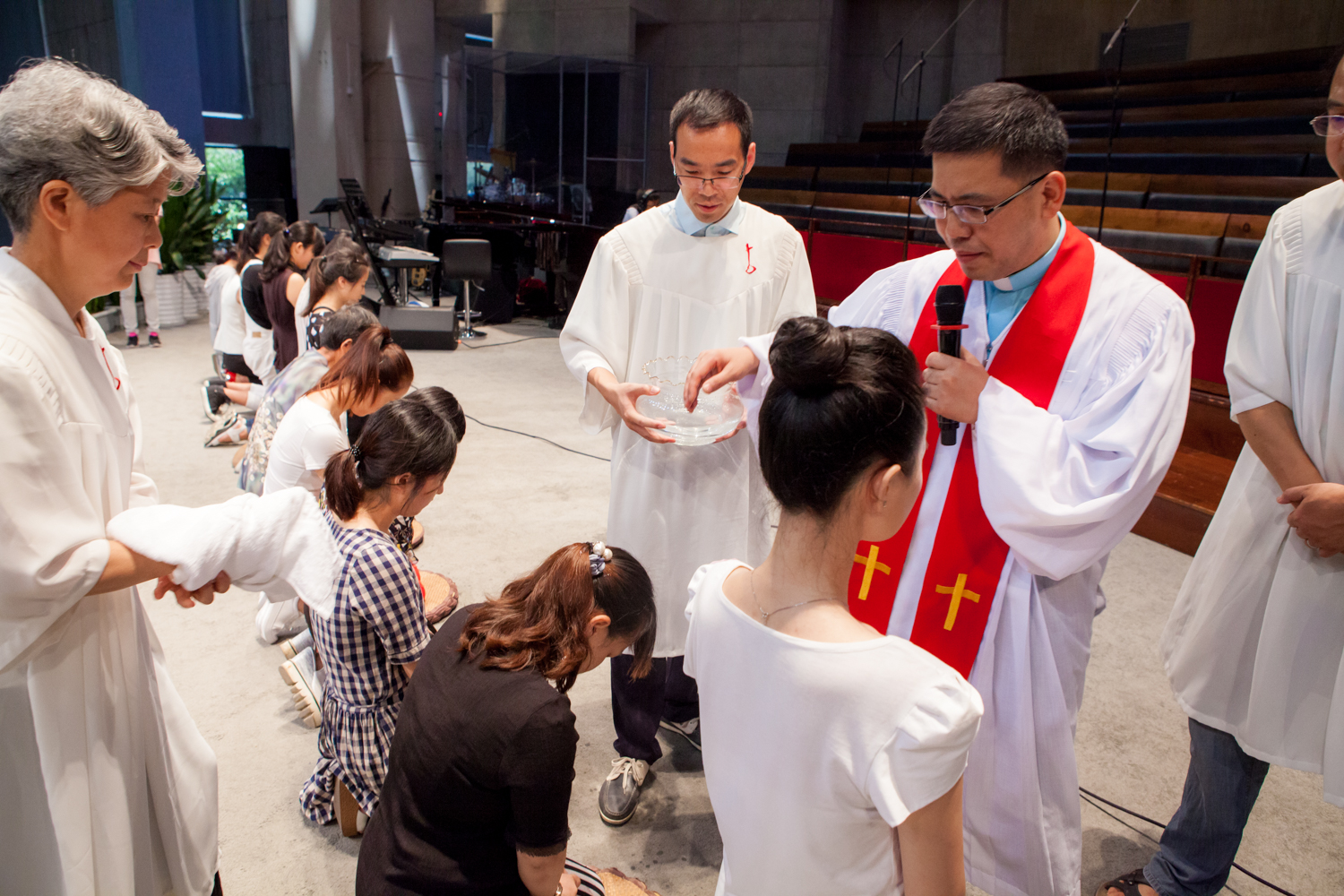 受洗者身着白色圣洁长袍,按照次序走向台上,走向十字架下方的浸礼池