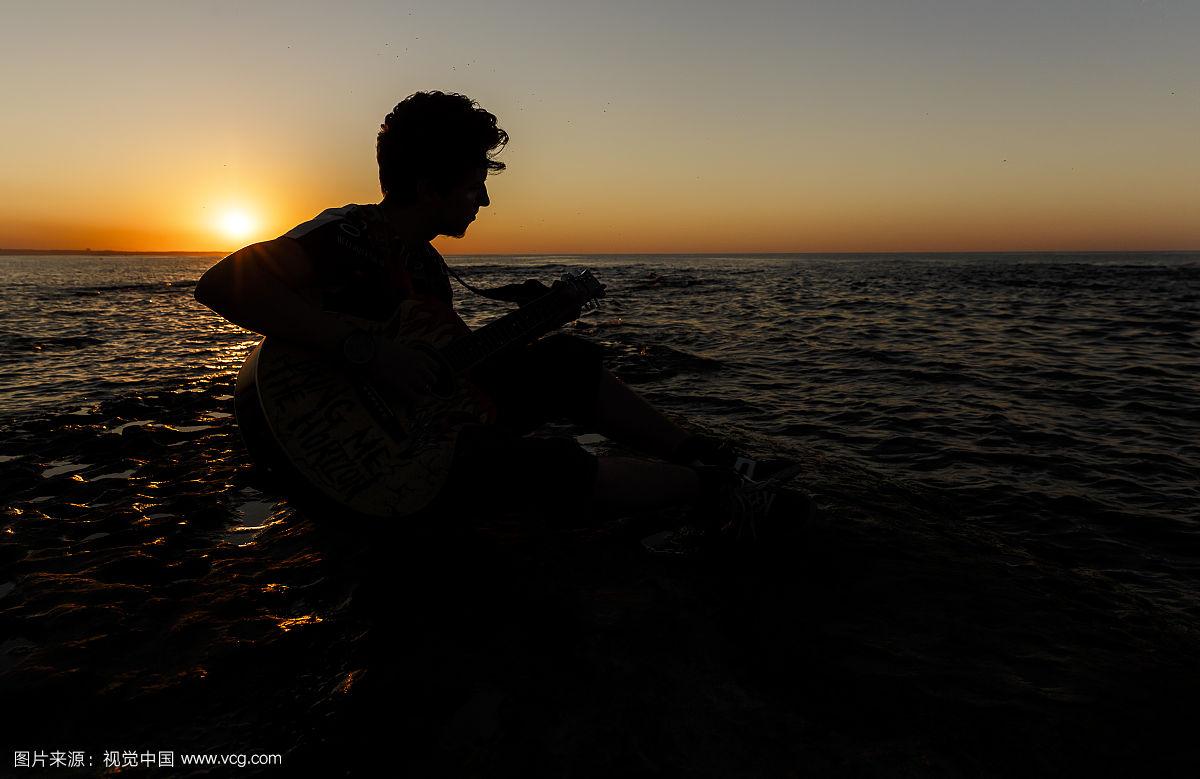 孤独的音乐家,一个孤独的吉他手在日落海滩上的剪影.