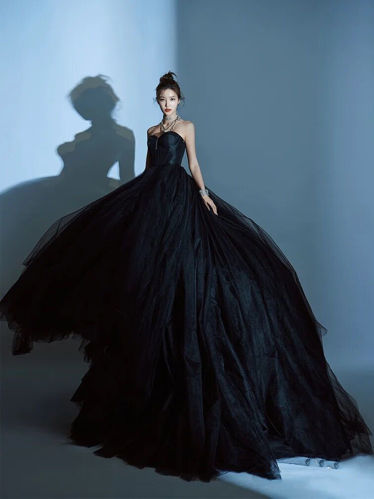 影楼新款黑色抹胸齐地婚纱主题服装新娘简约大气唯美小个子公主风