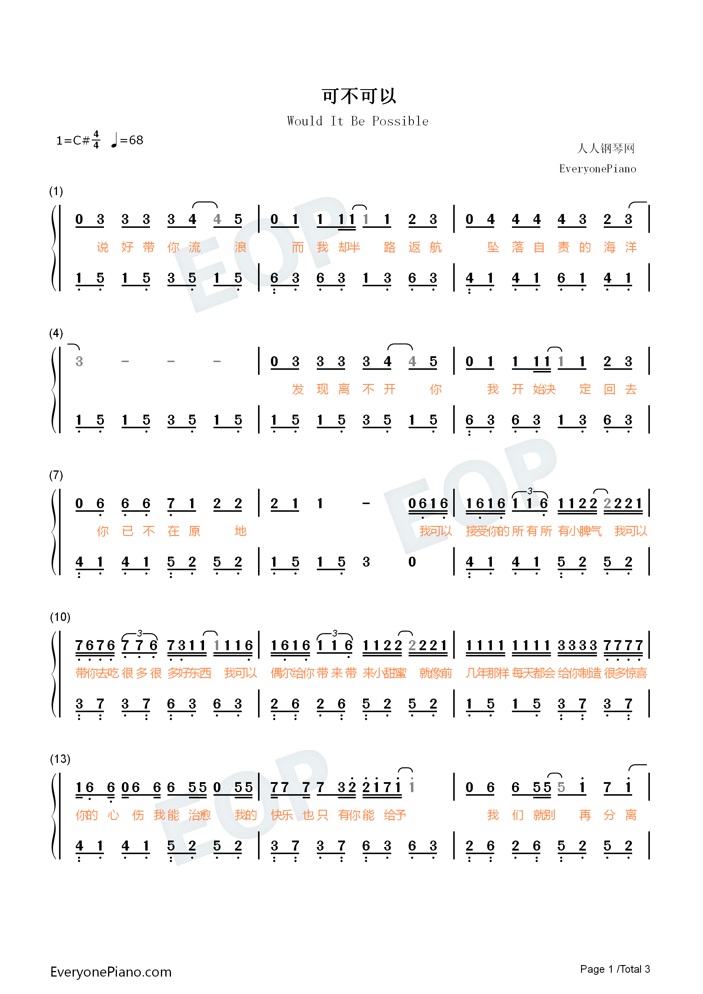 可能否-c调简单版-抖音热歌双手简谱预览1
