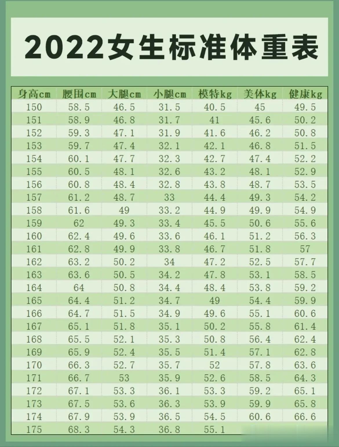 标准腿长对照表女性150175cm标准体重对照表