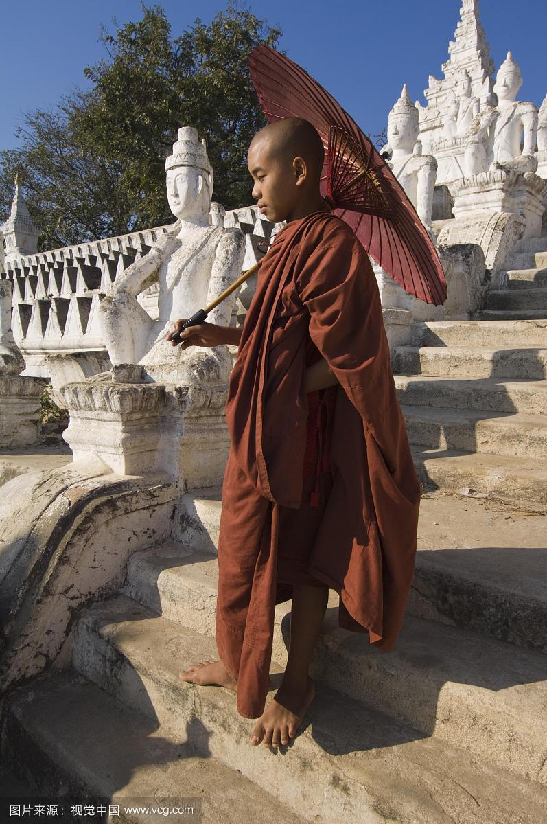 年轻的佛教和尚拿着红伞,舍塔维亚塔,缅甸,缅甸,东南亚