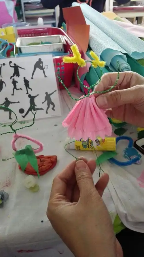 皮制成了漂亮的小花篮,刘新晨同学用废旧铁丝做的小人儿摆件栩栩如生