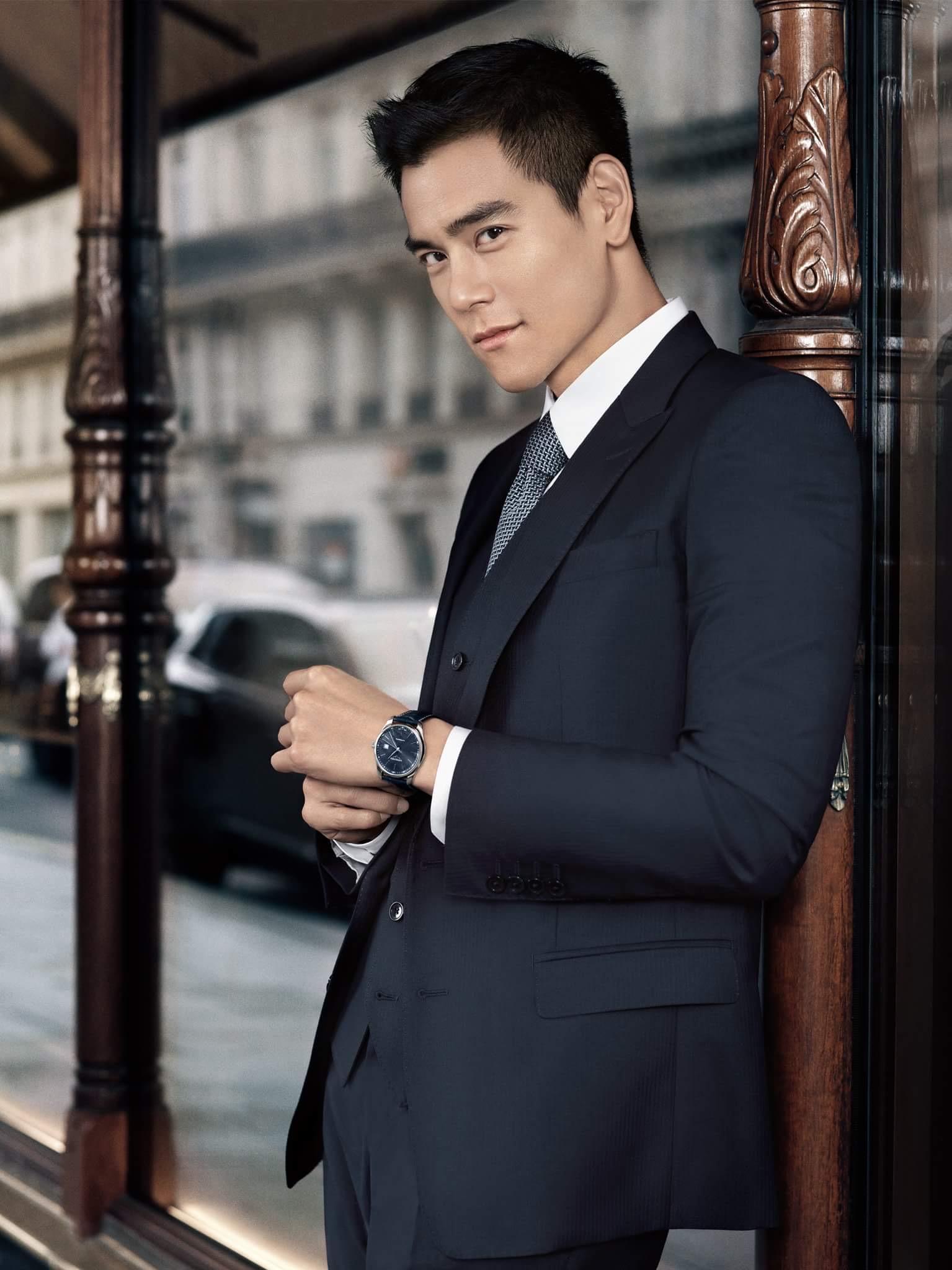浪琴表代言人彭于彭于晏为代言品牌拍摄全新形象照,他身穿蓝色西装