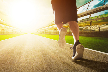 在阳光明媚的日子里, 跑步者的腿在体育场上奔跑, 特写男人在跑步机上