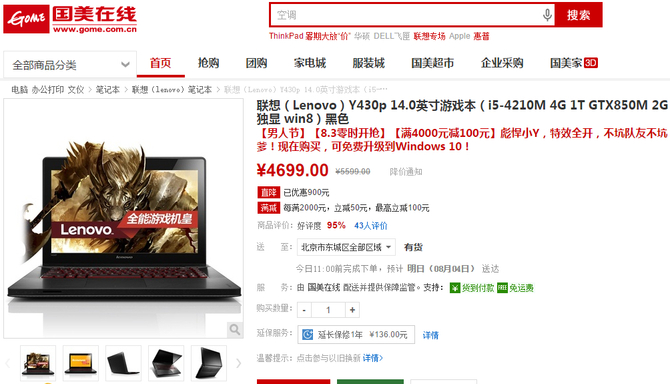 国美男人节 联想y430p独显游戏本4699元