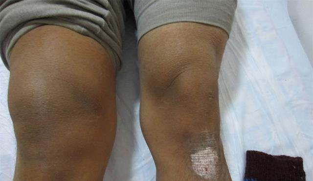 凹陷清晰;图片左侧的膝肿胀,表面更平滑 | wikimedia真正"有病"的膝盖
